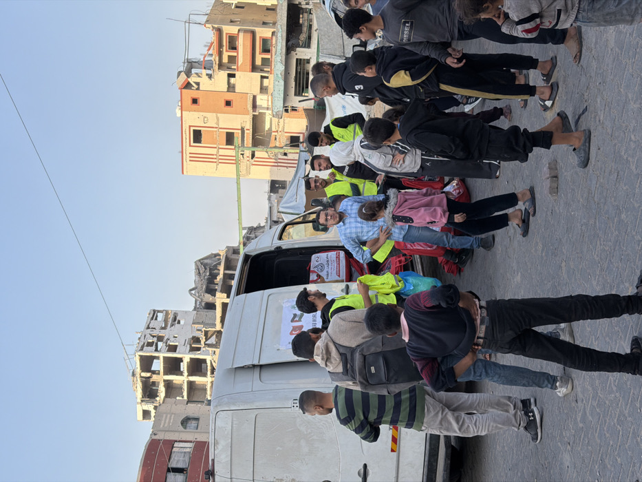 A group of people stand near a white van, likely receiving aid. Some wear yellow vests, possibly indicating they are volunteers or aid workers. Buildings in the background show signs of damage and destruction, suggesting the scene is in a conflict zone. The overall atmosphere is one of need and support amidst the aftermath of conflict.