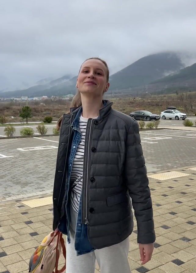 A young woman stands on a paved area in front of a mountainous background. She is wearing a gray puffer jacket, light gray sweatpants, and carrying a small tan backpack. She has her hair pulled back in a ponytail. The sky is overcast, and there is mist clinging to the mountains in the distance. The area appears to be a parking lot, with cars parked in marked spaces. The woman looks up, smiles, waves, and then poses with her hand near her face.
