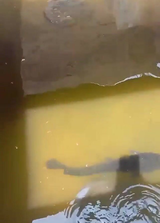 rectangular concrete tank filled with yellowish water. A large, dark fish is visible near the bottom of the tank. The water is murky, and the bottom of the tank is partially visible. The edges of the tank are made of concrete. The lighting suggests the video was taken outdoors in daylight. The camera is positioned above the tank, looking down. Bubbles can be seen rising in the water.