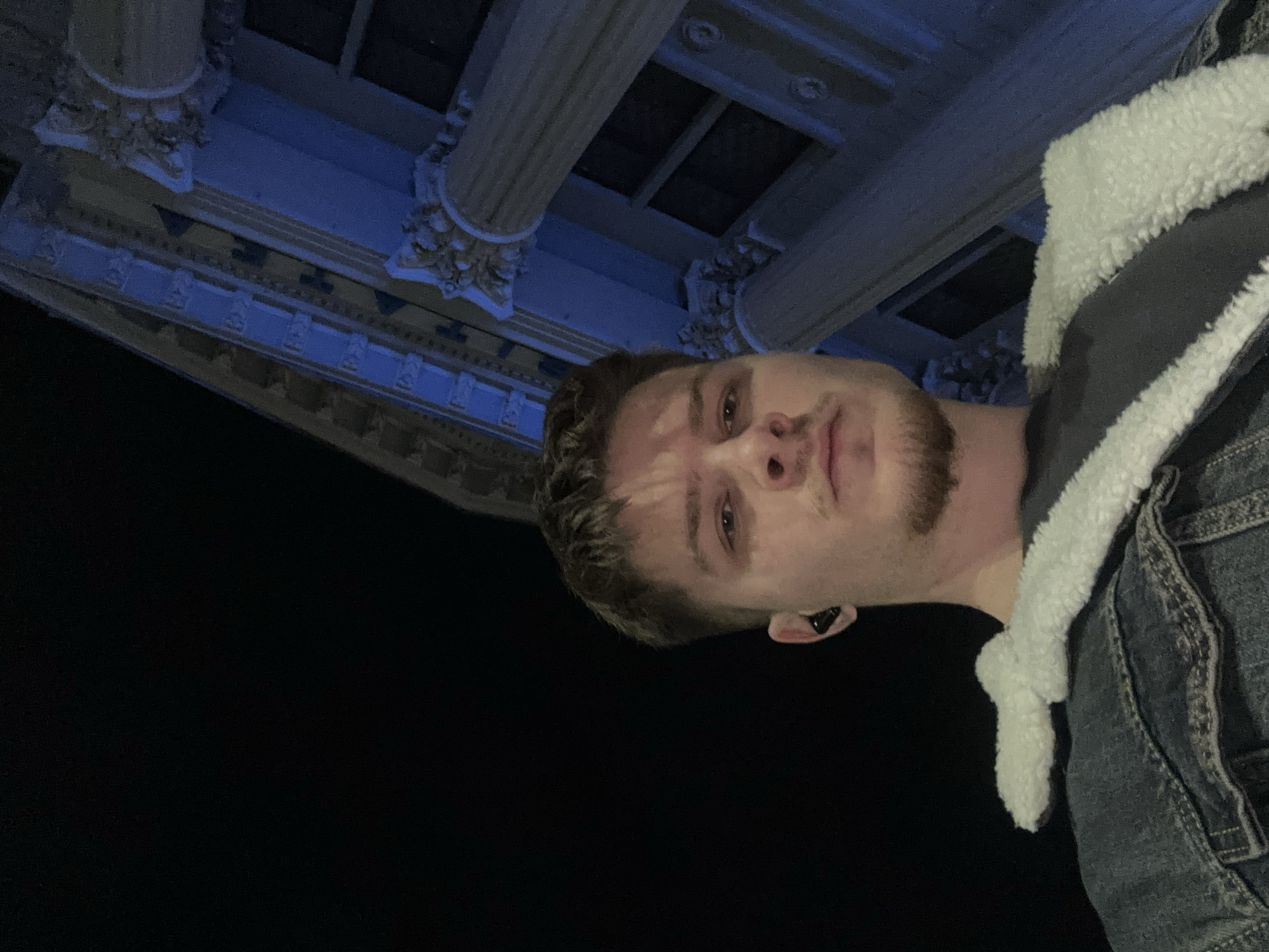 A male individual is depicted in a low-angle, head-and-torso level night-time selfie. He has short brown hair, a light mustache, and a short beard. A black in-ear earbud is present in his left ear. He is wearing a dark t-shirt and a dark denim jacket with a white, fluffy sherpa collar and lining. His expression is neutral. Behind him, angled upwards and to the right, is the illuminated facade of the Palatul Administrativ (Administrative Palace), which houses the Craiova City Hall, located in Craiova, Romania. The building exhibits classical architecture, featuring large fluted columns with ornate capitals and decorative cornices, all bathed in blue-toned artificial light against a dark night sky.