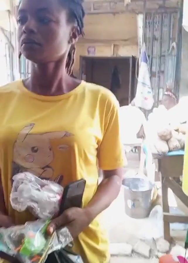 A young woman stands in what appears to be an open market or shop. She wears a yellow t-shirt with a cartoon print on it. She is holding a plastic bag containing items, including what looks like a plastic-wrapped food item. She also holds a small black object in her hand, possibly a phone or a small wallet. The background shows other people and various items typical of a market, including bags of goods, buckets, and signs. The scene is a bit cluttered with items hanging from the ceiling. The lighting is bright and natural, indicating it is likely daytime.