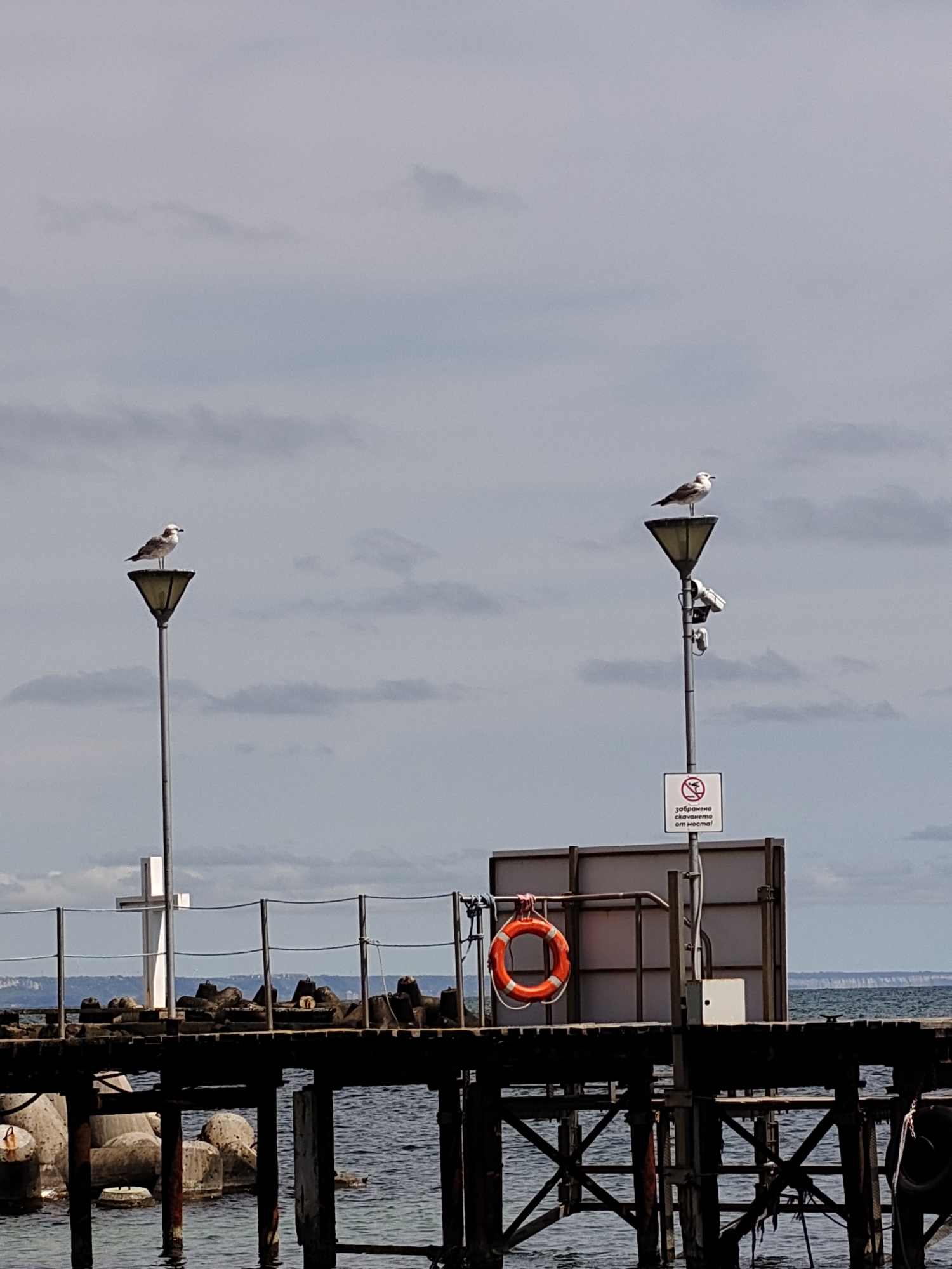 The image captures a pier scene in Varna, Bulgaria, featuring two seagulls perched atop lamp posts. The pier is constructed of dark wood, and a white cross is visible in the background. A white sign with Cyrillic text and a 'no diving' symbol stands near a grey structure with an orange life preserver attached. The sea is calm and the sky is overcast with grey clouds. Concrete tetrapods are visible beneath the pier and in the background.