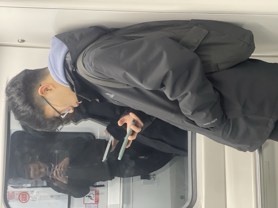 An individual is shown in what appears to be a train car. The person wears glasses, a blue hooded sweatshirt, and a black jacket with a backpack. They are holding a smartphone, possibly taking a photo, and their reflection can be seen in the window. The train car has a window, white panels, and some printed signage on the door. The person is positioned close to the window, and the focus is on them and their reflection.