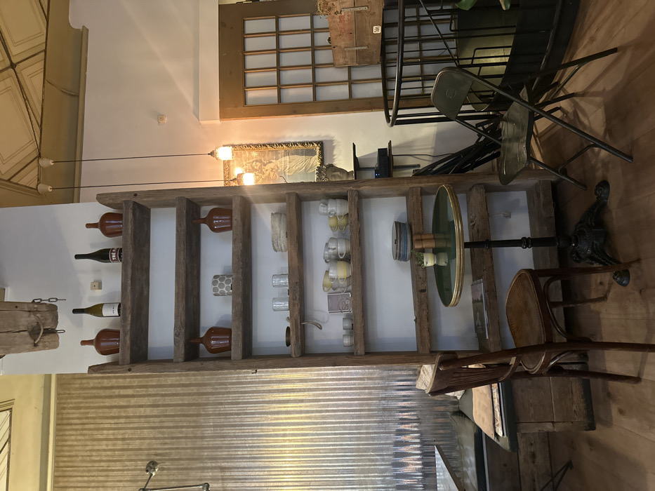 This image depicts the interior of a commercial establishment, likely a cafe or shop, located in Frederiksberg, Denmark. The scene is devoid of people. The floor is composed of light-colored wooden planks. A tall, rustic wooden shelving unit, constructed from large horizontal planks, stands prominently in the center against a white wall. The top shelf displays two dark reddish-brown bottles, two white wine bottles (one labeled "VIN BLANC," the other "TRÈ FLEUR"), and a third dark reddish-brown bottle. Above this, a rough-hewn wooden beam with metal chain links hangs from the ceiling. The second shelf holds two more dark reddish-brown bottles and a gray cylindrical container with a dotted pattern. The third shelf contains several clear glass tumblers and a stack of woven, circular objects. The fourth shelf is densely populated with stacked ceramic cups in white and light yellow/cream colors. The fifth shelf displays a stack of plates with blue rims, topped by a small potted plant on a wooden riser. Magazines or brochures are visible on the shelf below. To the left, a corrugated metal wall panel with vertical ridges extends, reflecting light. A portion of a metal wall-mounted light fixture is visible on the far left. In the foreground, from left to right, a dark-stained wooden chair with a slatted back is positioned. Adjacent to it is a small round table with a dark green top, a brass-colored rim, and a decorative black cast-iron pedestal base featuring claw feet. To the right of the table, a dark green, worn metal folding chair is placed. The background on the right features a tall, dark wooden door or panel with multiple rectangular glass panes arranged in a grid. Above the door, two pendant lights with small glass shades hang from a light-colored, patterned ceiling, possibly pressed tin. A framed artwork depicting a classical figure is mounted on the white wall to the right of the shelving unit. Below the artwork, a decorative white bust, resembling a head from a classical statue, rests on a small wall-mounted shelf. Further right, a dark metal railing or banister is visible, partially obscuring a wooden crate or box.