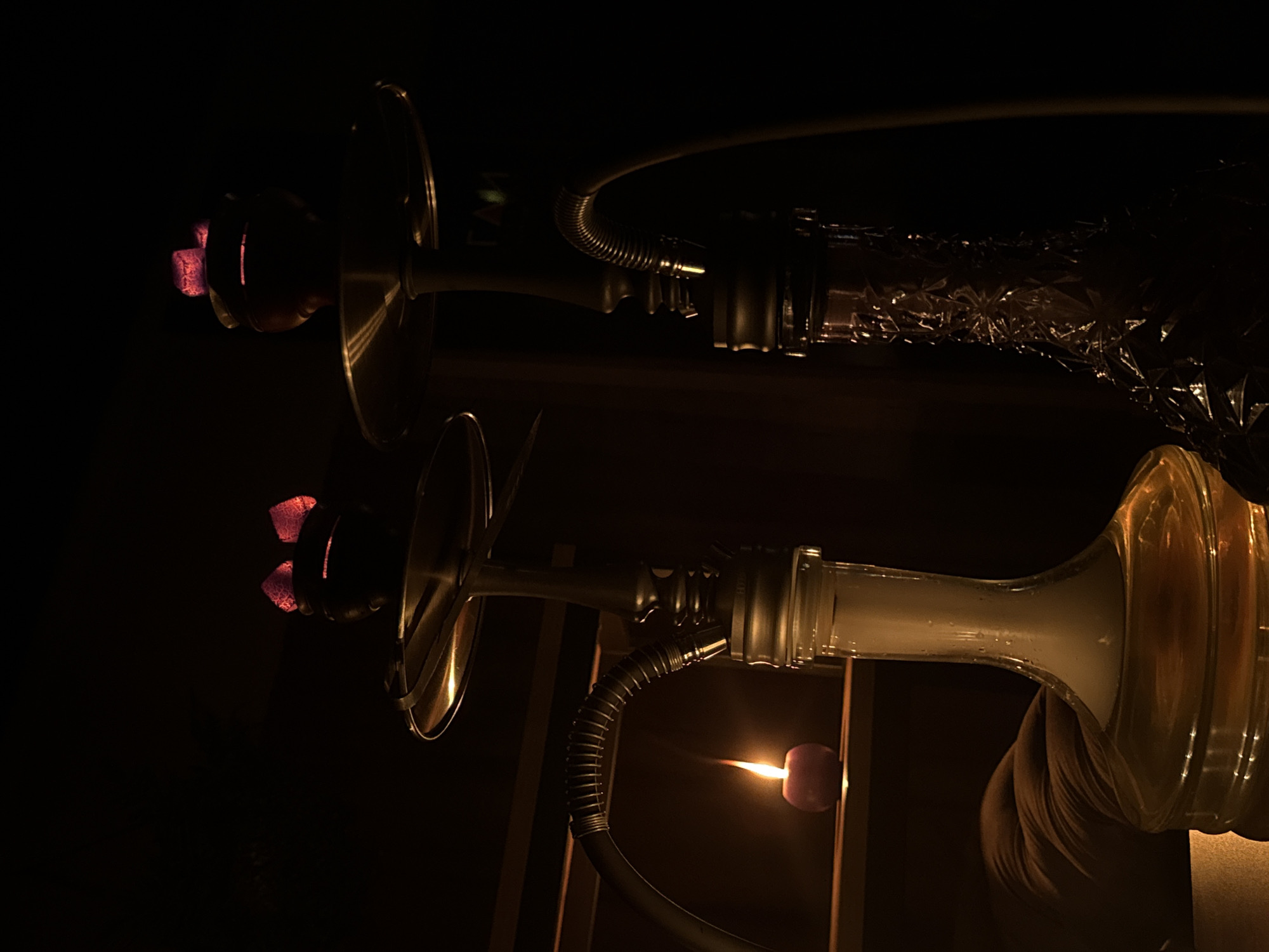 two hookahs in a dimly lit, presumably indoor, environment. The hookahs are side-by-side, with the tops of both featuring red-glowing coals. The body of the bottom hookah is glass and contains a cloudy substance. The hose of the bottom hookah leads to a mouthpiece that is glowing red, likely from being lit. The body of the top hookah is covered with reflective material. The exact location and city are unknown.