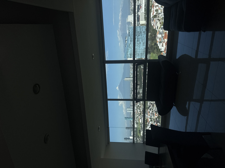 The image displays the interior of a room in a high-rise building in Puebla City, Mexico, offering a panoramic view of the urban landscape and distant volcanoes