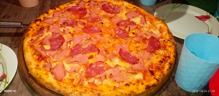 - "A pizza, loaded with ham and salami, sits on a wooden board" by FM-FVr0l2, licensed under CC BY 4.0