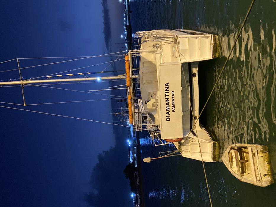 The image depicts a nighttime scene at a harbor in Punta de Piedras, Venezuela. The primary subject is a large white catamaran sailboat, named "DIAMANTINA" with "PAMPATAR" inscribed below, positioned centrally and viewed from its stern. The catamaran features two hulls, a prominent mast with rigging, and a furled sail exhibiting blue and white stripes. Orange flotation devices or life rafts are secured to the vessel's deck structure. A smaller, weathered wooden rowboat, light-colored and showing signs of age and possibly algae, is tethered to the stern of the catamaran and floats in the dark water. The water reflects various artificial lights from the shore and possibly the boats. In the background, a distant shoreline is illuminated by numerous bright artificial lights from buildings, structures, and a long pier or dock extending into the water. Vehicles, including buses, are discernible on the land, and a tall, slender structure, possibly a chimney or light tower, is visible among the background elements. The sky is a deep indigo blue, with dark clouds present. No individuals are visible in the scene.