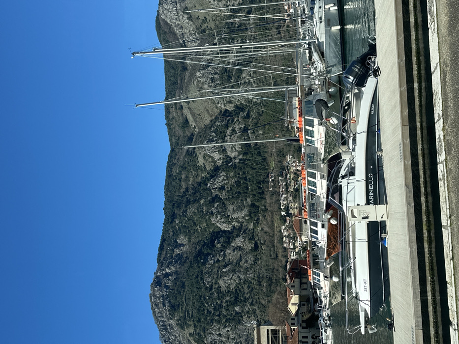 The image depicts a marina scene in Kotor, Montenegro, under a clear blue sky