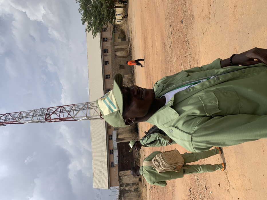 An outdoor scene in Bukuru, Nigeria, depicts a daytime environment under a partially overcast sky. The foreground is dominated by a young adult male of dark complexion, wearing a light green collared uniform shirt over a white undershirt, and a light green baseball cap featuring a white and light blue emblem. He exhibits a slight smile, revealing dental braces, and wears a black beaded bracelet on his left wrist. His body is oriented towards the right, with his head turned towards the viewer. Behind him, two other individuals, similarly dressed in light green uniforms and caps, are visible. One faces away, wearing light brown sandals and carrying a light tan backpack with a lion's head relief. The other is partially obscured, facing away, and carries a dark backpack. The background features a tall, red and white lattice tower, likely a telecommunications mast, rising into the sky. Below it, a large, multi-story building with a light-colored metal roof and numerous windows is visible. To the right of this building, an unfinished or dilapidated concrete block structure stands. Further right, a green-leafed tree is present. A single individual in an orange shirt and dark pants walks from left to right across the dirt expanse in the far background. The ground throughout the scene is unpaved, consisting of reddish-brown dirt. A low, dark wall runs across the mid-ground.