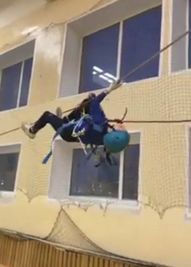 A person wearing a helmet, a blue long-sleeved shirt, dark leggings, white socks, and white athletic shoes is suspended mid-air from two cables. They are wearing a harness with blue straps. The person is hanging upside down, and their body is at an angle, facing upwards. The cables are attached to the ceiling. Behind the person is a high, beige wall with several white-framed windows with blue-tinted glass. The wall is covered with a netting. Below the wall is a painted floor with green and yellow sections, and a bench. The environment appears to be an indoor sports facility. The camera is positioned slightly below the subject and zooms in slightly.