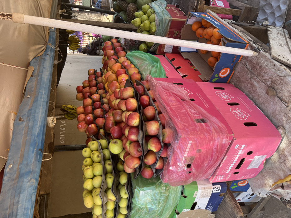 The image displays an outdoor fruit stall in Unguwar Rimi, Nigeria, illuminated by bright daylight