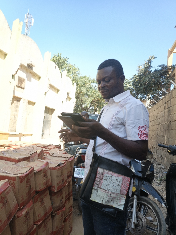 In Fagge A, Nigeria, an adult male of dark complexion, wearing a white short-sleeved collared shirt with red embroidery on the placket and a "FIFTY 2012 ZHENJIAO" patch on the left sleeve, stands outdoors under a clear blue sky. He is holding and viewing two dark electronic devices. A black shoulder bag with a distressed red and white patterned patch is worn across his body. To his left, a stack of approximately twenty light-brown cardboard boxes, marked with red bands and text including "CHICKEN" and "NAGALA", is piled. Behind these boxes, a motorcycle with a visible Nigerian license plate "GRK-41" is parked. The front wheel and suspension of another dark motorcycle are visible to the right. In the background to the left, a light-colored building with multiple rectangular window cutouts and a cellular antenna on its roof is visible. Green trees and a light-colored concrete wall are present in the background.