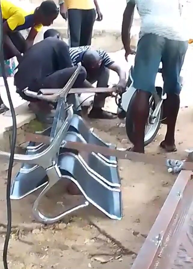 A group of people work on a motorcycle outside a building. They appear to be welding something to the bike. There is also a metal frame, an overturned chair, and various tools scattered around the work area. One woman watches the activity, while others stand around. Smoke is rising from the welding area.