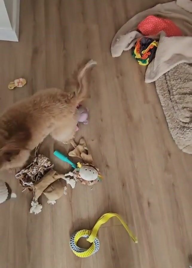 A high-angle shot depicts a light brown dog standing amid a pile of toys on a wooden floor
