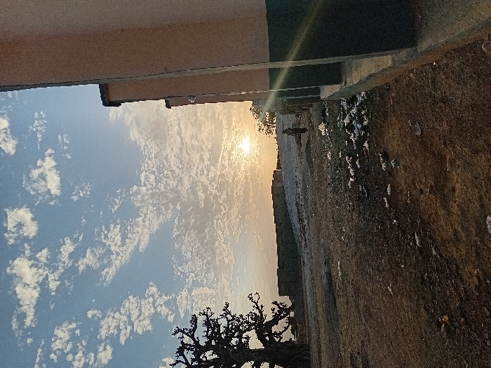 landscape at sunset. A tree is silhouetted in the lower left. Above, a sky filled with white, scattered clouds appears. The sun is obscured by the clouds, but its bright light shines through. To the right of the sky and above the tree, there is a dirt ground with scattered pieces of white debris. The top of the image shows a building structure.
