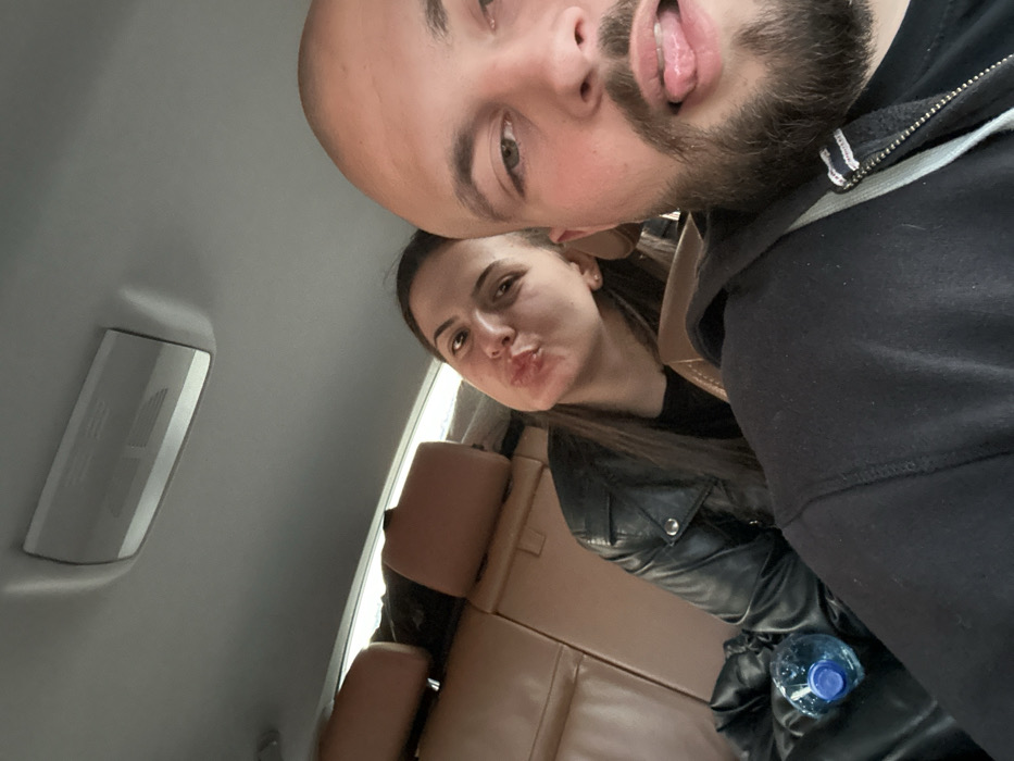 The scene depicts two individuals inside a vehicle, captured from a selfie perspective. An adult male occupies the foreground, with his shaved head, bearded face, and upper torso visible; he is looking towards the camera with his tongue extended. He wears a dark, possibly hooded, zippered garment with a light-colored drawstring. Behind him, an adult female is seated, identifiable by her long dark hair, black leather jacket over a dark top, and an earring in her visible left ear. She is making a "duck face" expression with pursed lips while looking towards the camera. The vehicle interior features brown leather seats with headrests, a light-colored ceiling, and an overhead fixture. A blue plastic water bottle is visible on the seat next to the female. The precise location within the city of Varna, Bulgaria, cannot be determined from the visual evidence presented in the image, as no exterior features or landmarks are discernible.