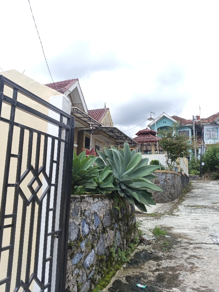 A stone wall topped with large agave plants lines a sloping, concrete road. A decorative metal gate stands to the left. Houses of varying colors and architectural styles are visible in the background, under a cloudy sky. Moss grows along the base of the stone wall. The road is uneven and appears slightly damp.