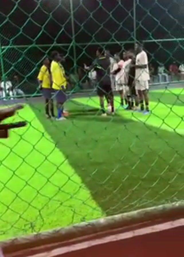 soccer game at night, viewed through a green mesh fence. Two teams, one in yellow and one in white and black, are gathered around the ball, presumably discussing strategy or addressing a rule. A referee in black is also present, seemingly mediating the discussion. The field is artificial turf, brightly lit by overhead lights. Several people are seen watching from the sidelines. The camera view is partially obstructed by various individuals wearing different clothing near the fence.