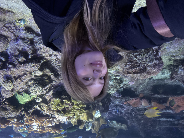 - "A young adult female is depicted in a selfie taken inside a large aquarium, specifically the Aquarium of Genoa in Genoa, Italy" by FM-yjK1X2, licensed under CC BY 4.0