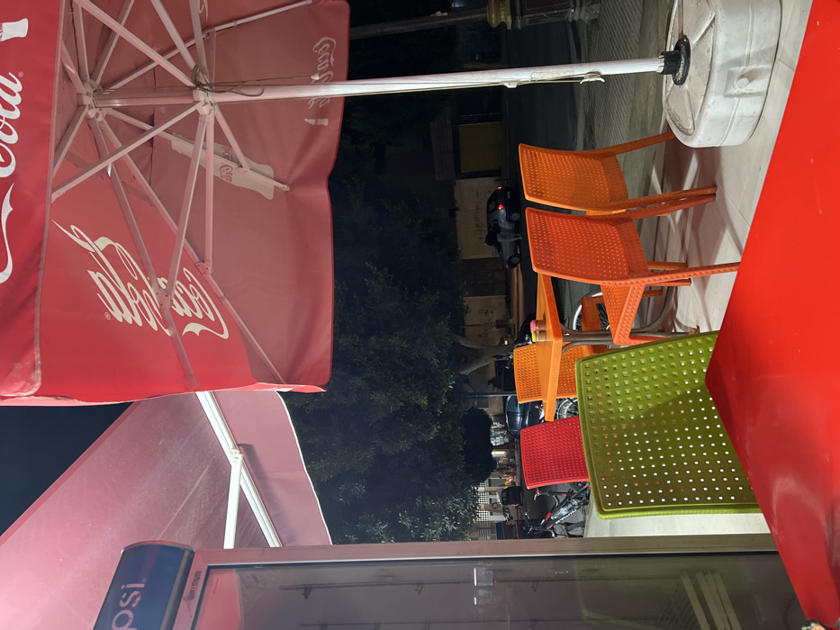 Outdoor restaurant scene featuring Coca-Cola umbrellas, colorful plastic chairs (orange, green, red), and glimpses of a Pepsi-branded structure