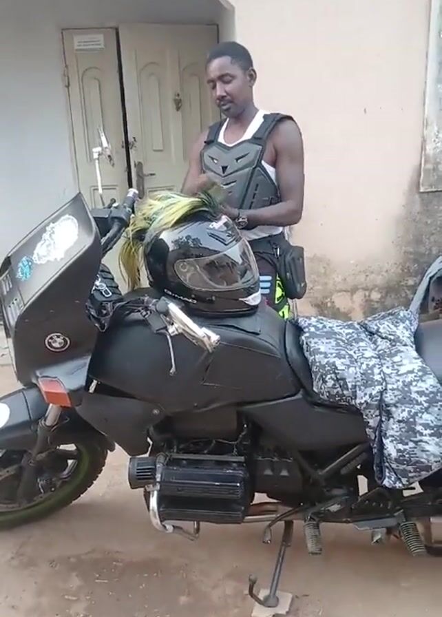 A man stands next to a black BMW motorcycle in front of a building. He is wearing a white tank top, shorts, a black chest protector, and a watch. The motorcycle has a black helmet with green hair on top of it. The motorcycle has a windshield and gray camouflage fabric covering the seat. The background shows a building with a double door. The ground appears to be dirt or dry soil. The man is seen adjusting his gear while next to the motorcycle.