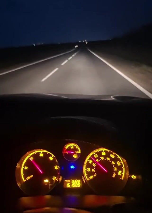 A view from the driver's seat shows a car driving at night on a straight road with double yellow lines