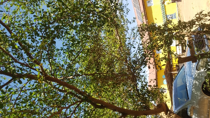 This image captures an outdoor scene in Bukuru, Nigeria, under clear, bright daylight. A large tree with a thick, visible trunk on the left and dense green foliage dominates the upper two-thirds of the frame, against a clear blue sky. Partially visible in the lower left, beneath the tree, is the front section of a silver Mercedes-Benz sedan. In the background, a two-story yellow building with a red-orange tiled roof is prominent, featuring multiple windows. Solar panels are installed on the building's roof. In front of the yellow building, a structure with a thatched or straw roof supported by poles is visible. A white pickup truck is partially discernible to the right of the sedan, behind the thatched structure. A person wearing a yellow shirt is partially visible on the far right side of the image, near the yellow building. The ground appears to be unpaved earth.
