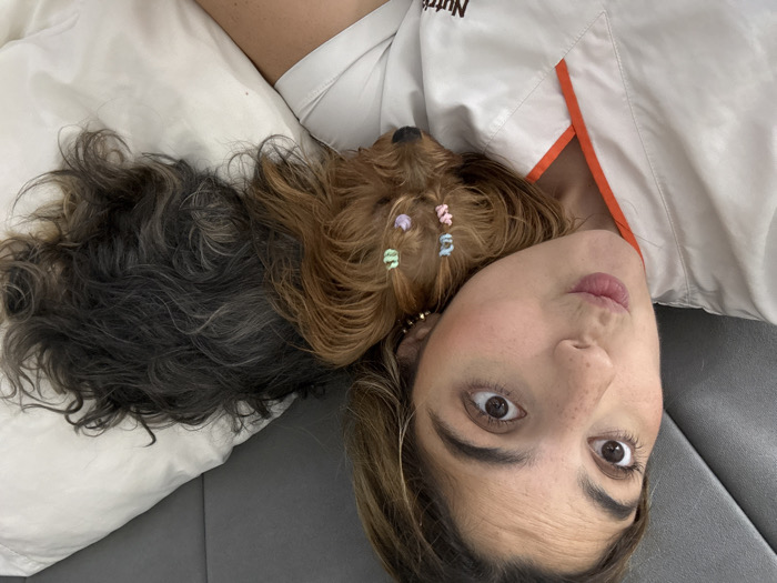 An adult female and a small dog are depicted indoors. The woman has light brown, wavy hair, brown eyes, and is looking directly at the camera with a "kissing" facial expression. She wears a white uniform top with an orange-trimmed V-neck collar; the text "Nutr" is partially visible on the lower right of her garment. A small Yorkshire Terrier dog, with brown and dark grey fur, rests its head on her right shoulder. Its topknot features four small, pastel-colored claw clips (light green, pink, light blue, light purple). The background consists of a dark grey upholstered headboard and a white pillow. The specific location within the city of Mérida, Mexico, cannot be determined from the visual evidence.