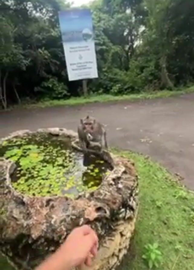 monkey taking food from a man's hand and then eating it. The monkey is sitting on the edge of a small stone pond filled with lily pads. In the background, there's a sign for West Bali National Park. The environment is lush and green, indicating a park setting. The man's arm is visible, offering the food, which the monkey takes and then sits to eat. The monkey has grey fur and a red face. The footage appears to be shot at close range, focusing on the interaction between the man and the monkey.