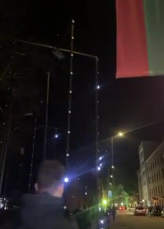 city street at night. There are people walking along the sidewalk and cars driving on the street. Above the street are tall structures with many small lights on them. The lights alternate between white and blue. There is a large flag hanging in the background.