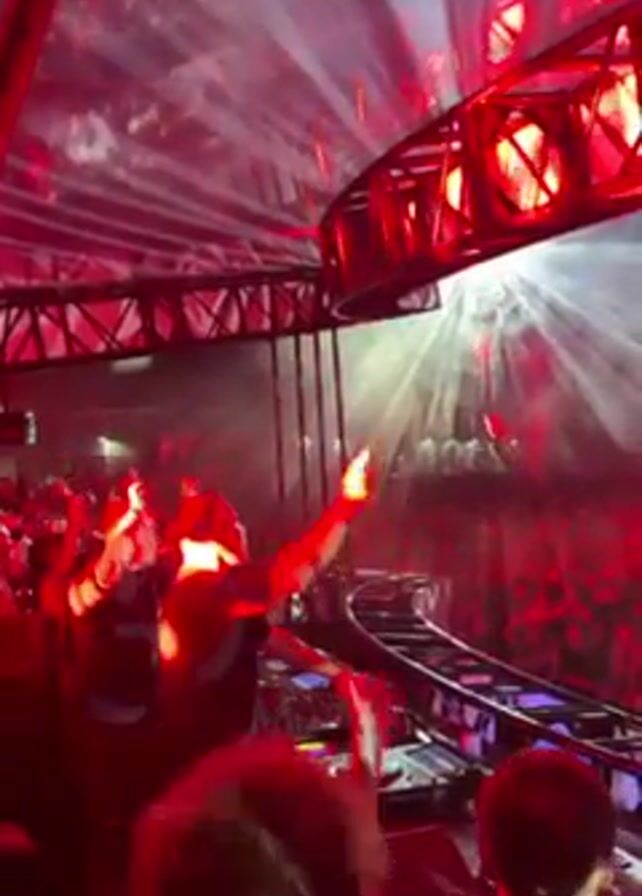 crowded nightclub with a DJ performing. The DJ is behind a deck, surrounded by equipment and raising his arms in the air, interacting with the crowd. The crowd is dense and enthusiastic, with many people raising their hands, enjoying the music. The lighting is dramatic, with bright red and white beams illuminating the space. A metal structure with lights is above the DJ booth. The venue appears to be large and well-equipped for a high-energy performance.