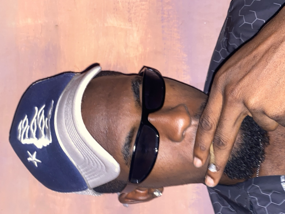 A person with dark skin wears sunglasses and a navy blue baseball cap with white embroidery and a star. They have a short, well-groomed beard and are holding their hand up to their face, near their mouth. The background is a light peach color. The person is wearing a patterned black and gray shirt.