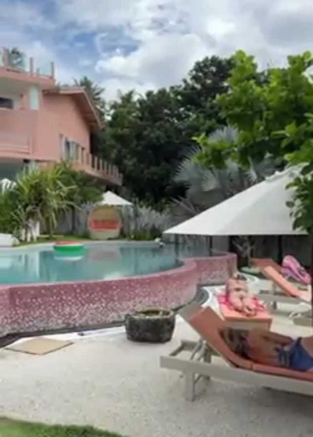 swimming pool surrounded by lounge chairs and a pink building in the background. Two women are lying on the lounge chairs, sunbathing. The pool is decorated with pink mosaic tiles, and a watermelon-shaped inflatable is floating in the water. The area around the pool is covered with gravel and grass. There are several white parasols providing shade. The building is a two-story structure with white balconies. The sky is partly cloudy.