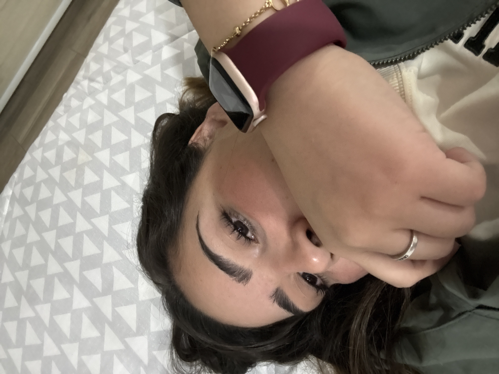 The image displays an overhead close-up of an individual, likely a female, lying horizontally against a surface characterized by a repeating pattern of white triangles on a light gray background. The subject's dark hair frames a visible portion of their face, which includes the left eye, part of the nose, and forehead, featuring defined dark eyebrows and apparent eye makeup. The right hand is positioned over the lower half of the face, obscuring the mouth and chin. A maroon-colored smartwatch with a rose gold-toned casing is worn on the right wrist, alongside a delicate gold chain bracelet. A silver-toned ring is present on the ring finger of the right hand. The individual is dressed in a dark olive green jacket, revealing a zipper and a white inner lining. A blurred light brown object, possibly furniture, is discernible in the upper left background. The specific indoor location within Santa Clara Ocoyucan, Mexico, is not visually identifiable from the image content.