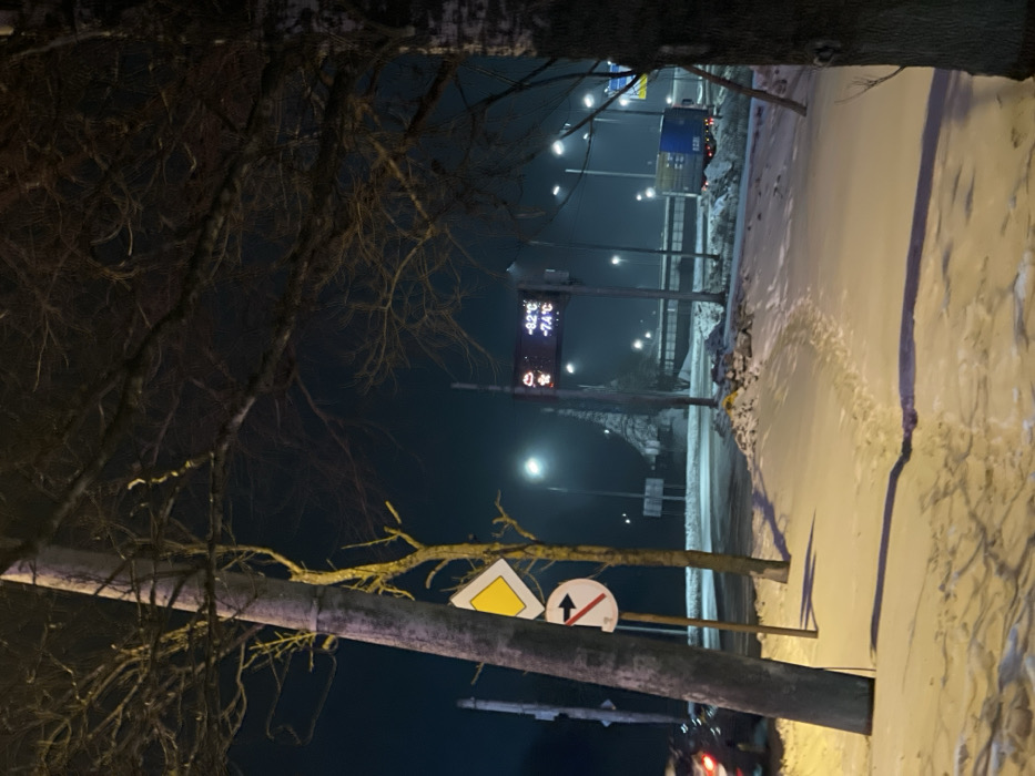 A roadside scene at night reveals extreme cold, with a digital display reading -8.2°C and -7.4°C. Snowy banks line the roadside. Bare trees frame the image, obscuring some of the view. Streetlights illuminate the road, and a highway overpass is visible in the distance. Road signs are affixed to a post, including a yellow triangle warning sign and a white sign with a black arrow crossed by a red line. A car's headlights shine in the bottom right.