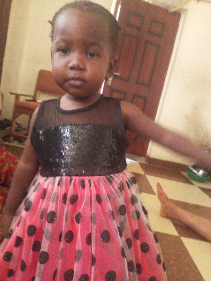 A young child, approximately two to four years old, stands centered and facing the camera in an indoor setting located in Unknown, Unknown. The child has dark skin and short, dark hair, wearing a sleeveless dress featuring a black sequined bodice, a sheer black mesh neckline, and a pink tulle skirt with numerous black polka dots. A small gold-colored hoop earring is visible in the child's left ear. The child's left arm is slightly extended to the side. The floor is covered with light and dark brown checkerboard tiles. In the background, a light-colored wall is visible, along with a dark brown wooden door featuring paneling on the right. To the left, part of a wooden chair with a brown cushion is present. On the far left, a patterned fabric in red, orange, and green is partially visible. To the right of the child, a bare human foot and lower leg, with red toenail polish, are visible on the tiled floor. A green container with a metallic object inside is partially visible on the floor near the door.