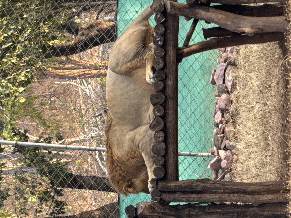 - "An adult male lion with a tawny coat and a prominent mane is depicted resting or sleeping on a raised wooden platform within an enclosure" by FM-8gHP13, licensed under CC BY 4.0
