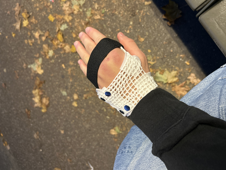 An overhead, close-up forensic image captured in Geispolsheim, France, displays a human left arm and hand. The arm is clothed in a black long-sleeved garment, possibly a sweatshirt, with a light blue denim fabric, likely jeans, visible below the sleeve. The hand wears a white, open-lattice patterned wrist brace, secured by four dark blue circular fasteners along its radial aspect and a black textile strap crossing the palm. A reddish-purple contusion is visible on the dorsal surface of the hand. The background consists of dark asphalt or concrete pavement sparsely covered with dry, yellow and brown autumn leaves. Direct sunlight illuminates the scene, casting a distinct shadow in the lower right, indicative of an outdoor setting and a nearby structure, possibly a bench.