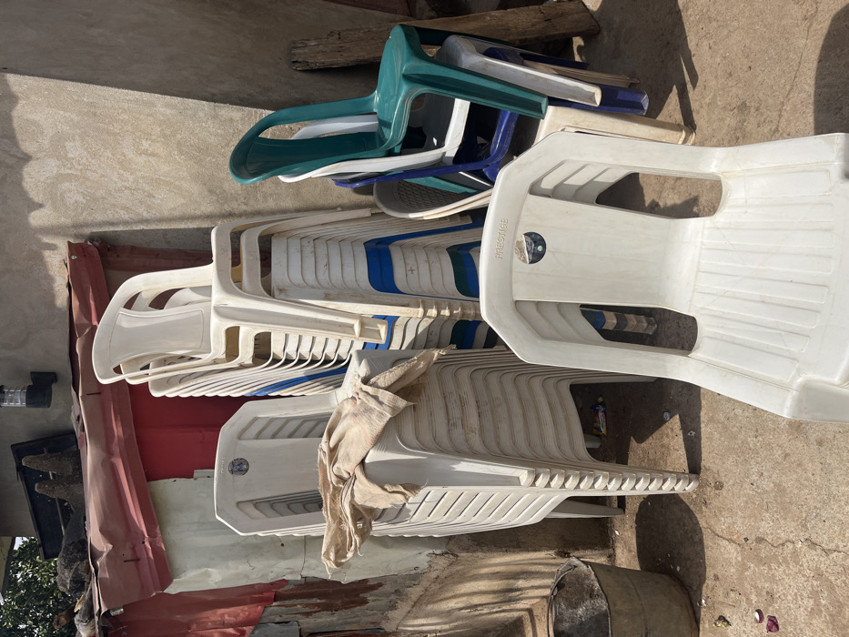 This image captures an outdoor scene in the city of Kakau, Nigeria, under bright sunlight, highlighting multiple stacks of plastic chairs against a backdrop of utilitarian structures
