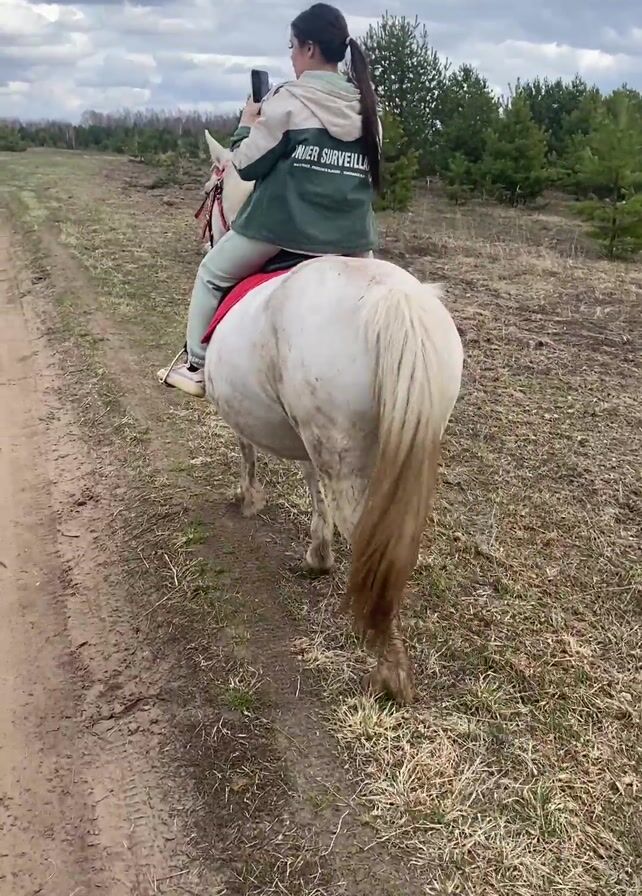 A woman with dark hair tied in a ponytail is riding a large, white horse down a dirt path. The horse is wearing a red saddle pad. She is wearing a green and beige jacket and jeans. She is holding a smartphone in her hand, possibly taking photos or video. The surrounding environment is a field with scattered patches of dry grass and young pine trees. A brown foal with a white blaze on its face is seen trotting across the field toward the path. The sky is overcast. The camera follows the horse and rider as they move along the path.