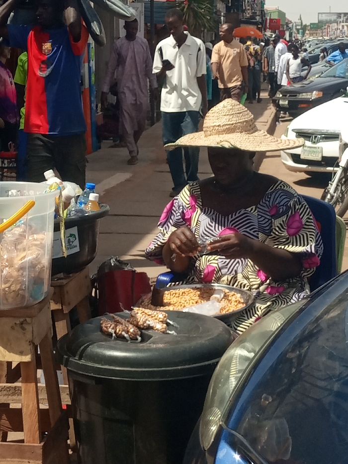 This image depicts a bustling street scene in Jos, Nigeria. In the foreground, a dark-skinned woman wearing a wide-brimmed straw hat and a multi-colored patterned dress sits on a blue plastic chair. She is actively packaging food, holding a small clear plastic bag in her hands and appearing to fill it from a large metal tray of light brown, roasted groundnuts or similar snacks positioned on her lap. On a black lidded barrel to her immediate left, several small clear plastic bags containing brownish, textured items are arranged. Further left, on a wooden stand, a transparent plastic container holds various plastic-bottled beverages and additional packaged food items. In the mid-ground, a paved sidewalk features several pedestrians. A man in a white polo shirt and blue jeans walks while looking at a smartphone. Another man in a light purple traditional Nigerian garment (agbada) walks behind him. Further left, a man wearing a red and blue FC Barcelona jersey carries an object resembling a tire on his left shoulder. In the background, a street lined with parked vehicles, including a white Honda sedan and a blue car (partially visible in the extreme right foreground), stretches into the distance. Additional individuals and commercial structures are visible along the street, under bright daylight conditions.