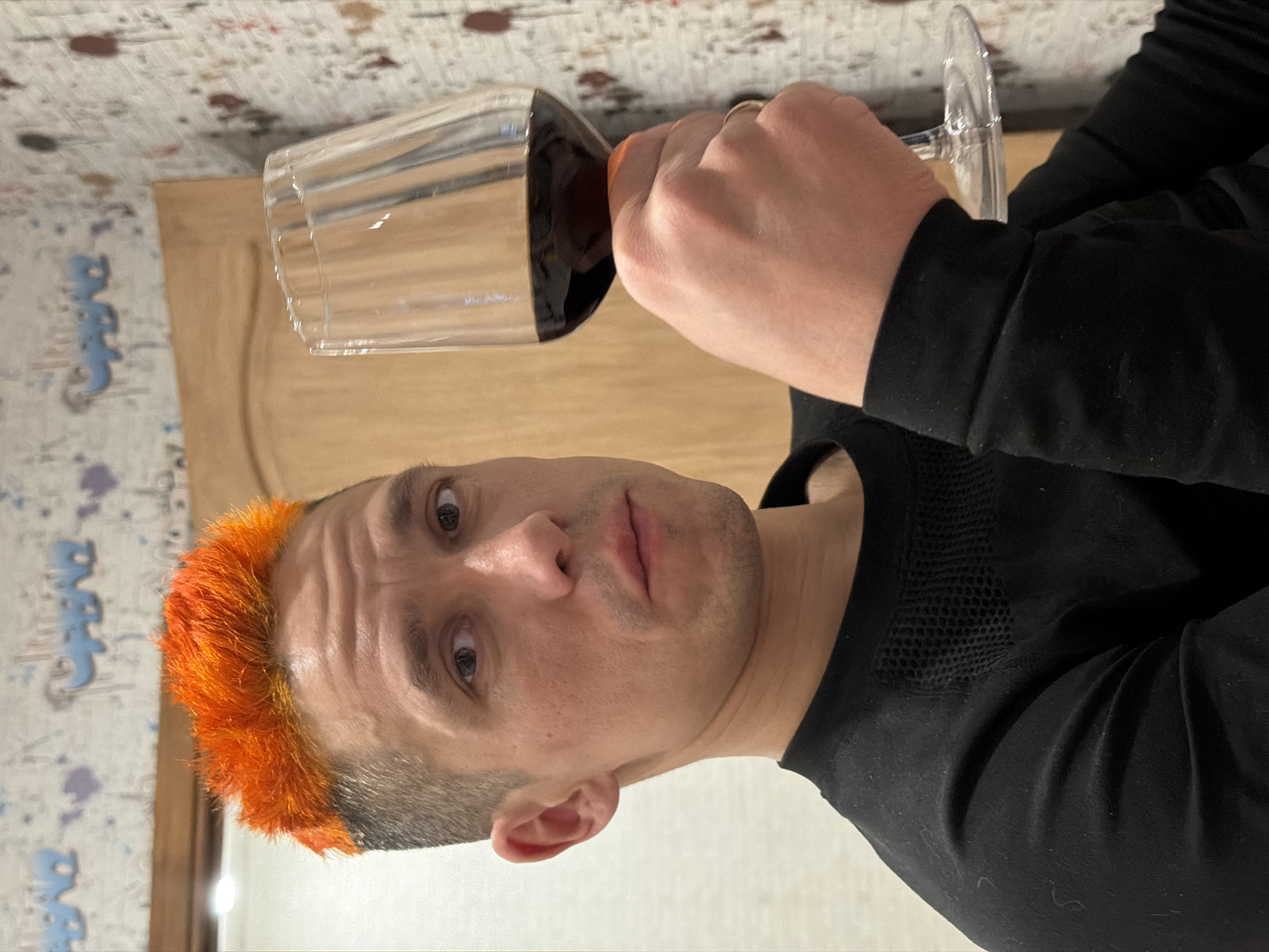 A fair-skinned person with orange hair holds a glass of dark liquid, likely wine. They are wearing a black long-sleeved shirt. The background consists of a light-colored wall with a repeating pattern and a wooden cabinet door. Location is unknown.