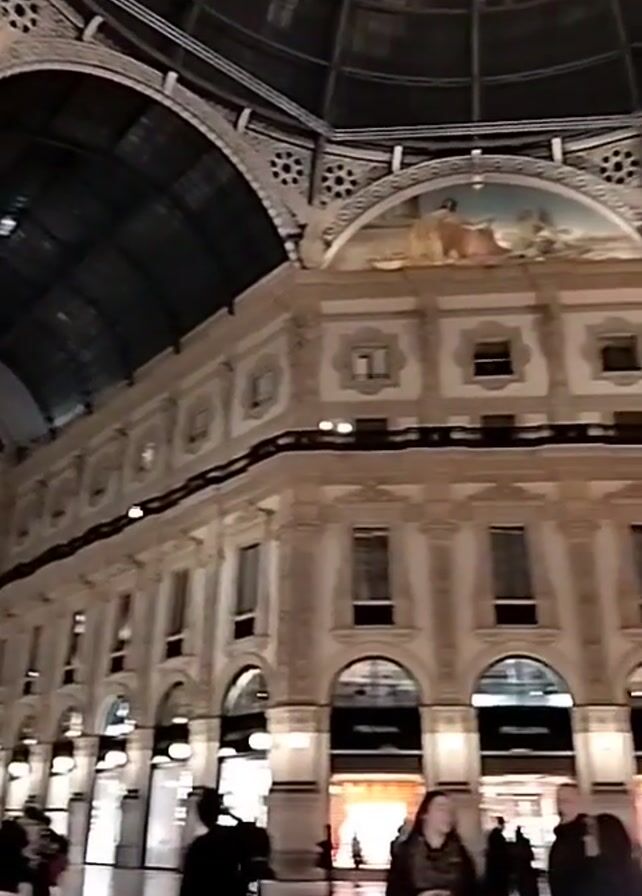 The video showcases the interior of a large, ornate building, likely a shopping gallery or arcade. The structure features a high, glass-covered dome or ceiling, under which symmetrical rows of beige buildings line a polished floor. People can be seen walking through the space, some pausing to look at the shops. A Prada store is visible. The architecture is classical, with arched windows and decorative elements. The lighting is warm and creates a sense of grandeur.