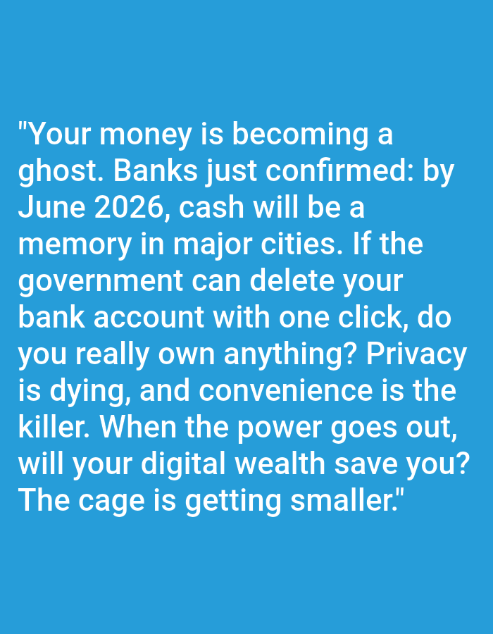 The image presents a warning about the potential decline of cash and the rise of digital currency. It claims that cash will be obsolete in major cities by June 2026, as confirmed by banks. The text raises concerns about governmental control over bank accounts and the illusion of ownership. It questions the reliance on digital wealth during power outages and suggests a diminishing sense of freedom.