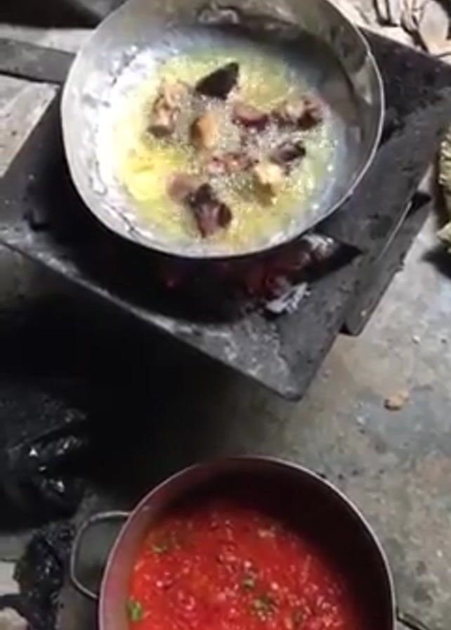 The camera looks down on a stovetop where chunks of dark meat are frying in oil, situated above glowing coals. To the lower right, a pot of thick, bright-red sauce with green flecks sits nearby. The stove appears worn, and the surrounding floor is textured, with other miscellaneous items in the periphery.