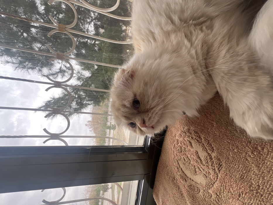 - "A long-haired, cream and ginger bicolor cat, likely a Scottish Fold given its folded ears, is positioned on a textured brown surface resembling a towel or blanket, looking out a window" by FM-RkAm93, licensed under CC BY 4.0