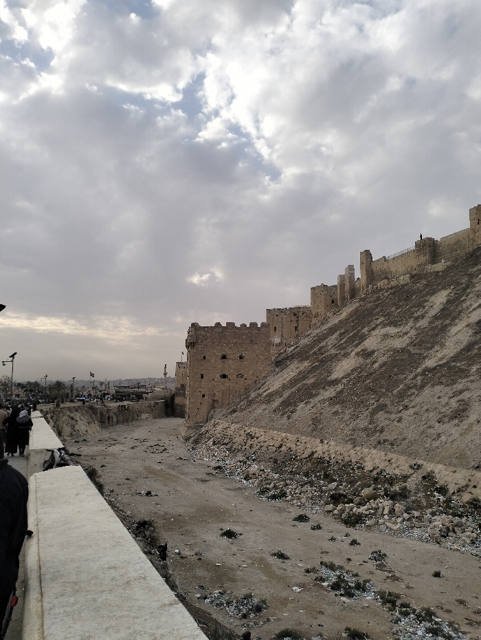 A tall, stone fortress wall rises on a dry, rocky slope under a cloudy sky. A deep, barren ditch separates the wall from a walkway with people. Sparse vegetation dots the ditch floor. The walkway is edged by a low, concrete barrier, with figures partially visible on the left side, suggesting a public space or viewing area. The overall scene is arid and historical.