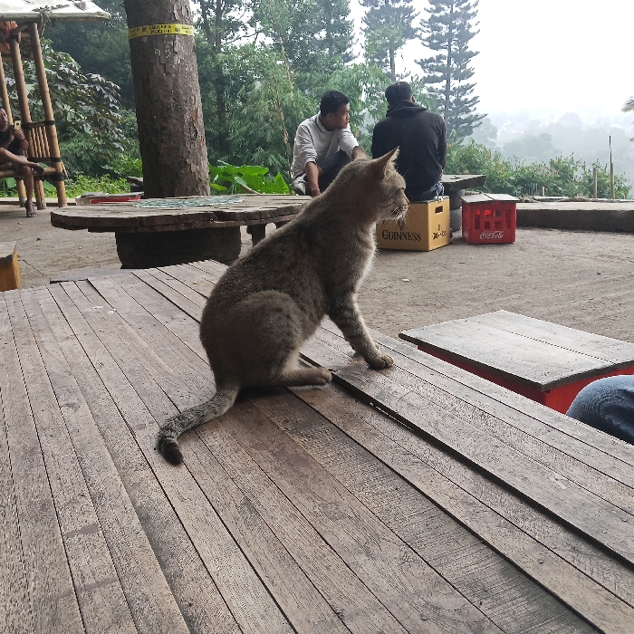 The image depicts an outdoor area in Gadog, Indonesia. In the foreground, a medium-sized grey tabby cat is seated on a wooden plank floor, facing right with its head turned to the right. In the mid-ground, two adult males are seated on a concrete surface. One man, wearing a light-colored long-sleeved shirt, faces the other man, who is wearing a dark hooded top and seated on a yellow "GUINNESS" crate. A red "Coca-Cola" plastic crate is positioned nearby on the concrete. A large, irregularly shaped wooden table is situated behind the cat and in front of the seated men. To the left, a large tree trunk, partially wrapped with yellow tape, stands next to a bamboo-like structure where a third individual is partially visible. The background consists of dense green foliage, tall trees, and a hazy distant landscape, indicative of a valley or hills. The setting suggests an open-air establishment or resting point.