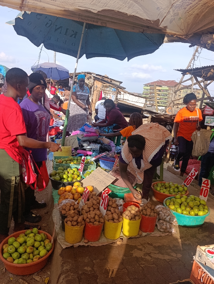 An outdoor market scene in Githurai, Kenya, is depicted under partial shelter from a large, light blue umbrella